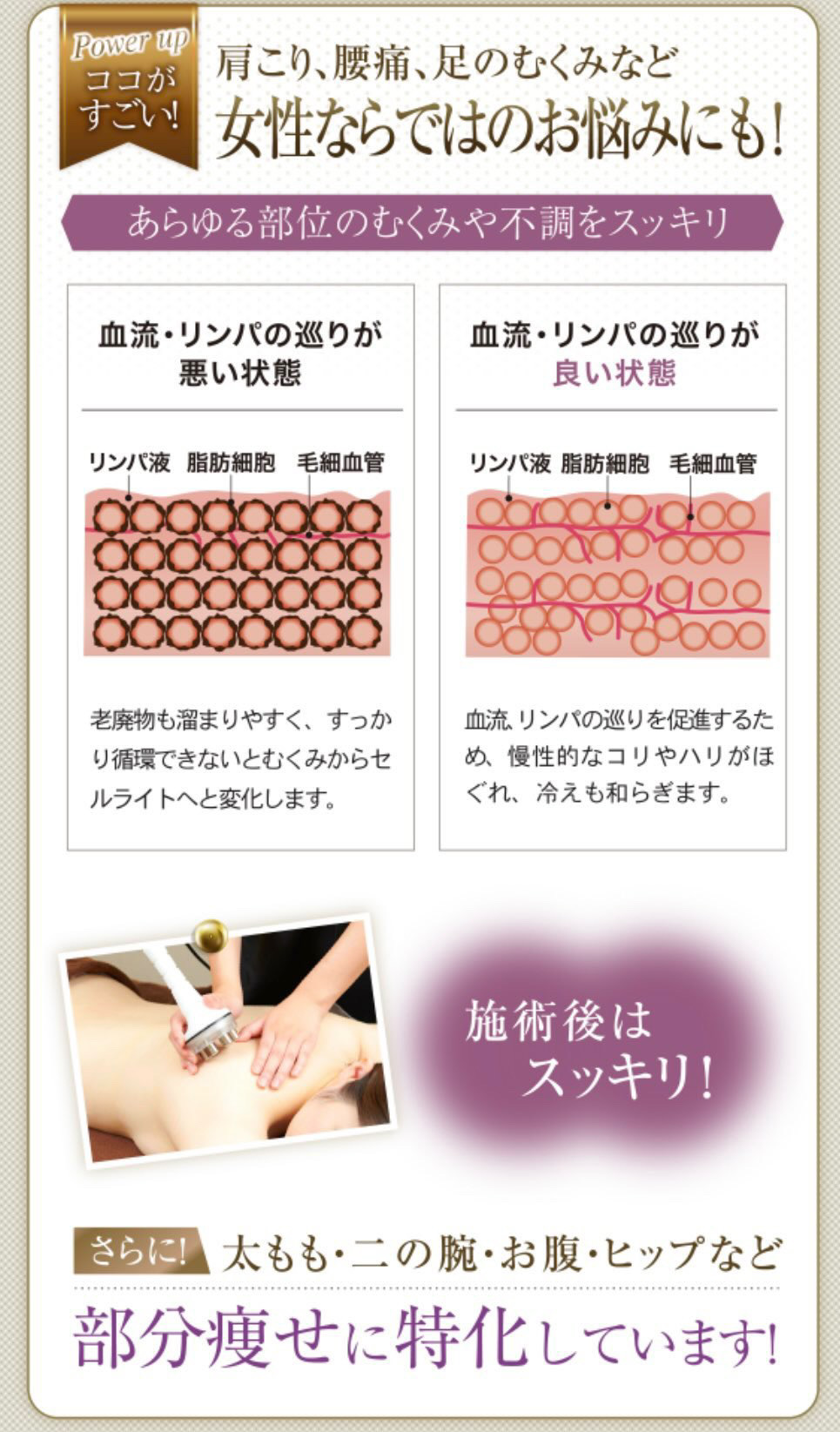 「脚が細く見える」「ウエスト周りがスッキリした」など、見た目の変化を実感しやすい施術です。
