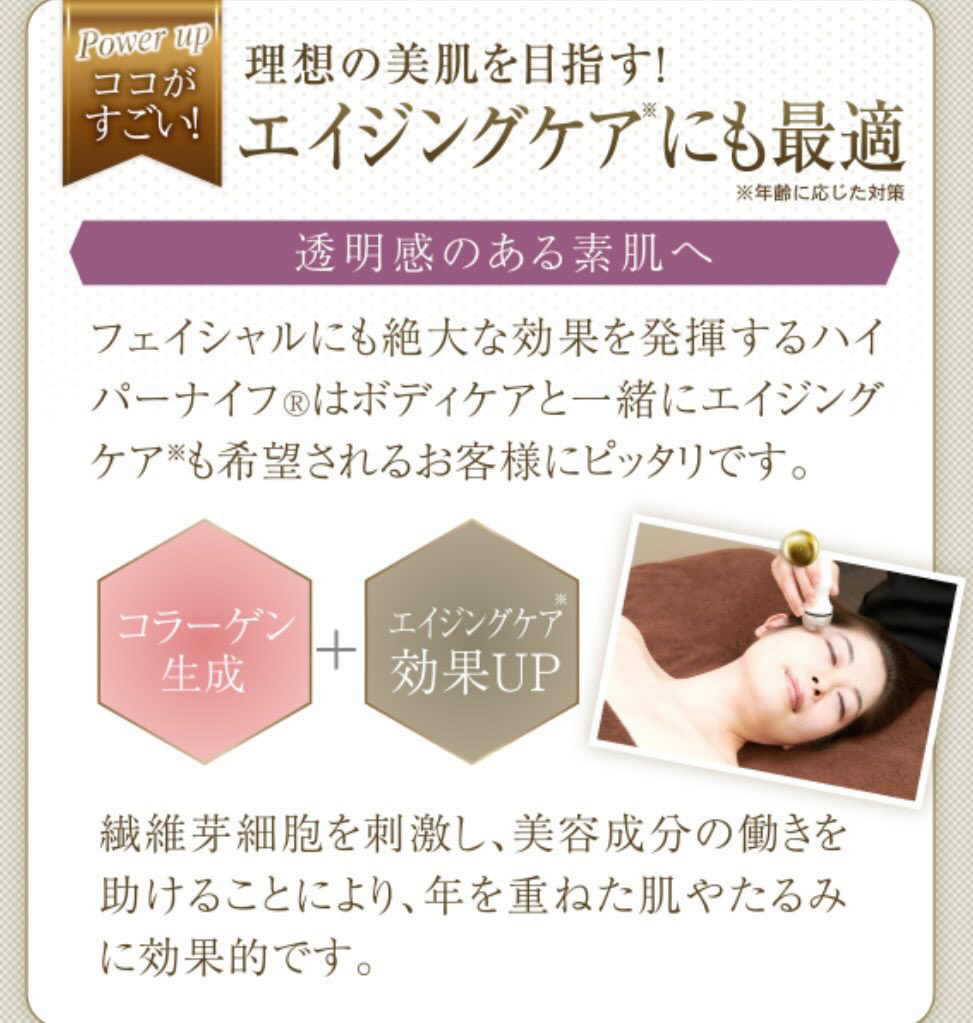 脂肪細胞の働きに着目した成分で、ハイパーナイフの温熱と組み合わせることで、脂肪ケア・引き締め・サイズ感の変化をサポートするとされています。
