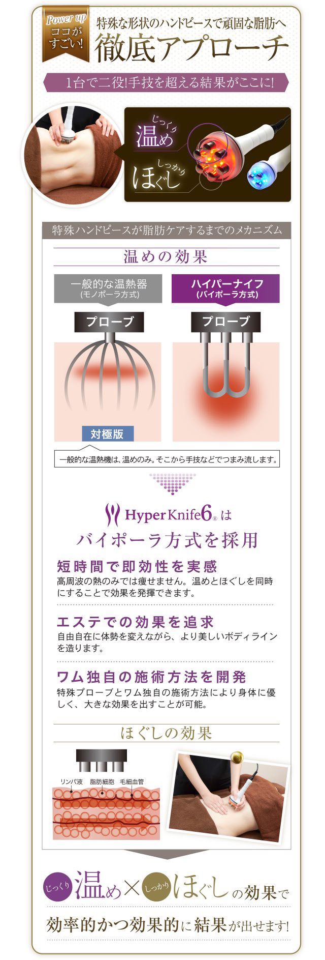 ハイパーナイフは、ラジオ波(高周波)の温熱作用によって身体の深部までしっかり温め、脂肪やセルライトに集中的にアプローチする痩身ケアです。